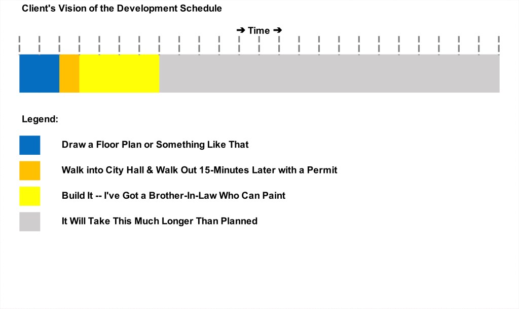 The most important person/entity on any project is the one who decided to do it (and pay for it) in the first place: the client. They know there are steps involved in the development process, but more often than not, they drastically underestimate the number of steps and length of time it takes to turn an idea into a building or space. Let’s graphically approximate what a typical client might imagine for a development schedule…