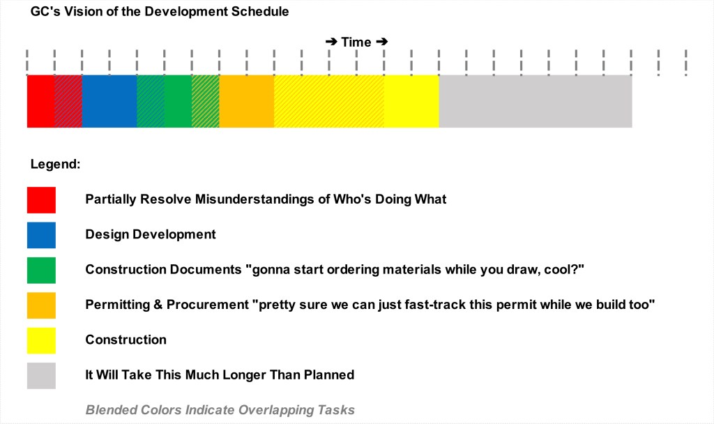 GCs love focusing on every last little step of construction, which isn’t necessarily a bad thing at all for that phase, but we need that level of planning for the rest of the project too, folks. There’s frequently a desire to overlap phases of project delivery by starting the next step before the last step is finished — and especially to start building while permitting is happening. The GC will take the project team through all sorts of machinations to figure out how to make that overlapping happen, usually without enough consideration of the downsides of fast-tracking things. Overly optimistic timeframes are a hallmark of GC schedules as well, at least for the stuff that’s not construction.