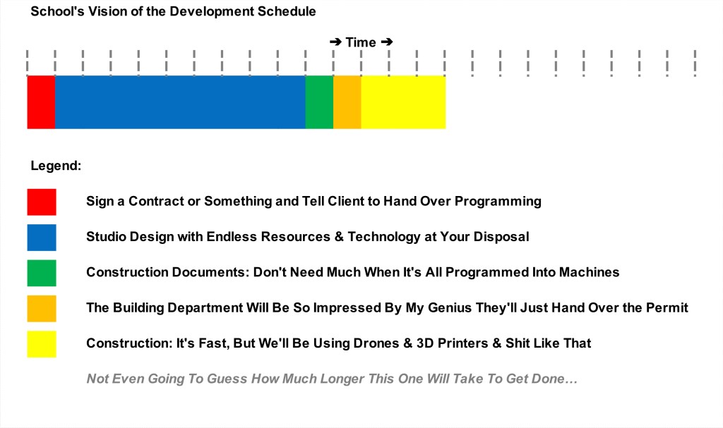 Okay, obviously not a member of the project team, but I wanted to include architecture schools to show the wakeup call emerging architects get after they step out in the real world. Architecture schools haven’t been the best when it comes to teaching their students about unsexy parts of the architect’s job like development schedules. There are a lot of reasons for this, enough to probably warrant their own article, so let’s skip ahead to look at the way many architecture schools envision a project’s development schedule…
