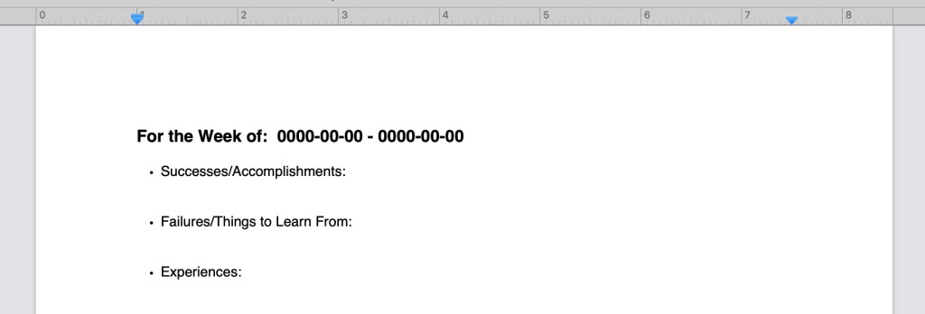 My current template has a heading where I enter the dates at the beginning and end of the week. Then three sections below that for my thoughts on the week: