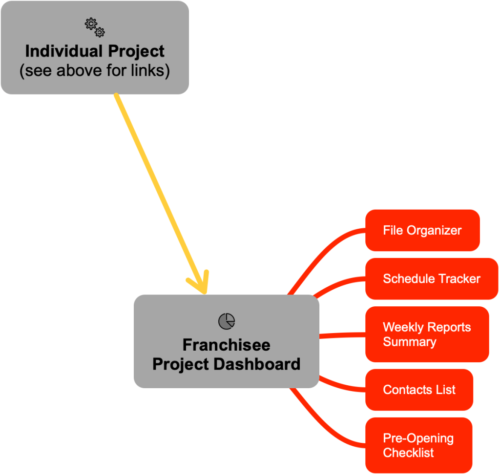What’s shown above is for corporate-owned projects. Franchisee-owned projects are tracked in much the same way, but everything above works behind the scenes from the franchisee’s point of view. A franchisee-specific Dashboard is generated from this data for them to see and interact with for their projects, which looks like this in the mind map…