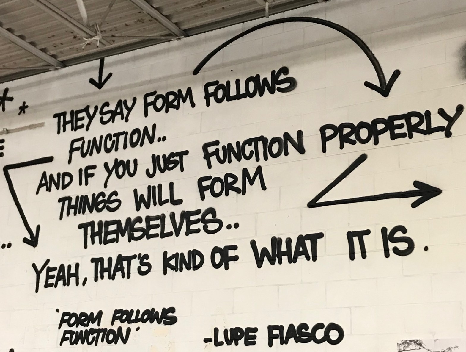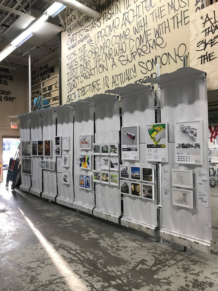 The conversations with the non-architect visitors to the exhibit were the highlight of my time working the show. Many of the visitors were younger hip-hop fanatics who heard about what was happening at the old dealership, or even people from the neighborhood who happened upon the exhibit. There’s something disarming about being inside of the service bay of a former Ford dealership and surrounded by hip-hop art, music, and examples of its architecture — it’s not at all aloof, flaky, out of touch, artsy and impractical, unaffordable (the exhibit was free), or hard to understand. For those visitors where I had a chance to ask about their interactions with architects and architecture as a topic, they all said it was a first time experience for them. Despite that lack of experience, these visitors were able to quickly grasp the ideology behind Hip-Hop Architecture and apply it to what they were seeing in the exhibit pieces. This approachability and accessibility to a design movement is a stark contrast to the morass of Euro-centric architectural history that architects are taught in architecture school — not to divide us by differing design movements either — if anything, the historians remind me of battle rappers one-upping each other with more and more obscure knowledge as they argue over Boullée or some shit like that on Twitter, of course history is important. But the approachability through authenticity of Hip-Hop Architecture is incredibly powerful at a time when architecture desperately needs to attract diverse talent to a profession that’s almost all white and is frankly out of touch socially.