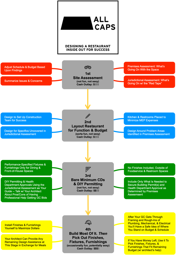 What the bare minimum construction documentation does is embed all the intelligence gained from detailed research into a quick and cheap set of documentation that can be quickly permitted and built. In a worst case scenario, you use up your entire budget just getting to the point in development of having a built out space with a raw dining room, but you’ll have an operating restaurant — even if you have to start delivery only or fill the dining room with card tables and folding chairs sitting on bare concrete like a garage, this joint will be up and running and able to generate revenue — let your great food and hospitality speak for itself.