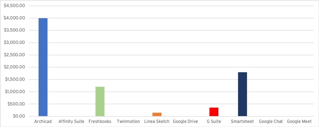 The annual costs related solely to the firm’s BIM authoring tool licenses (Archicad) come out to 0.62% of revenues (you’ll recall from the original article that annual revenues were $650K), slightly ahead of Andy’s claim for Revit. I was able to get the total software licensing costs down to 1.2% of the fictitious firm’s annual revenues. Maybe Andy was talking about his competition’s costs instead of Revit??? 😉